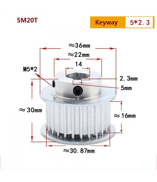 Type: solid pulley Model Number: 5 M Pitch: 5 millimetersbore diameter : 14MMNumber of teeth: 20 Material: Aluminum..