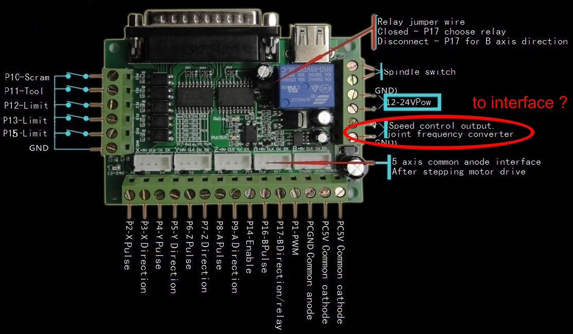 P1 can be used to output PWM signal,and can control the spindle Speed Regulator that has a photocoupler for input.